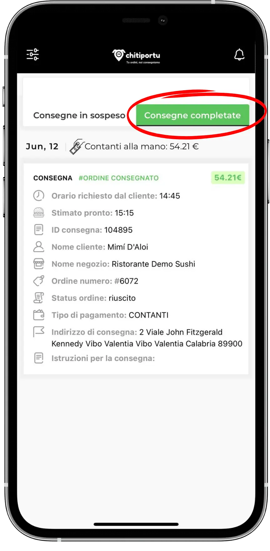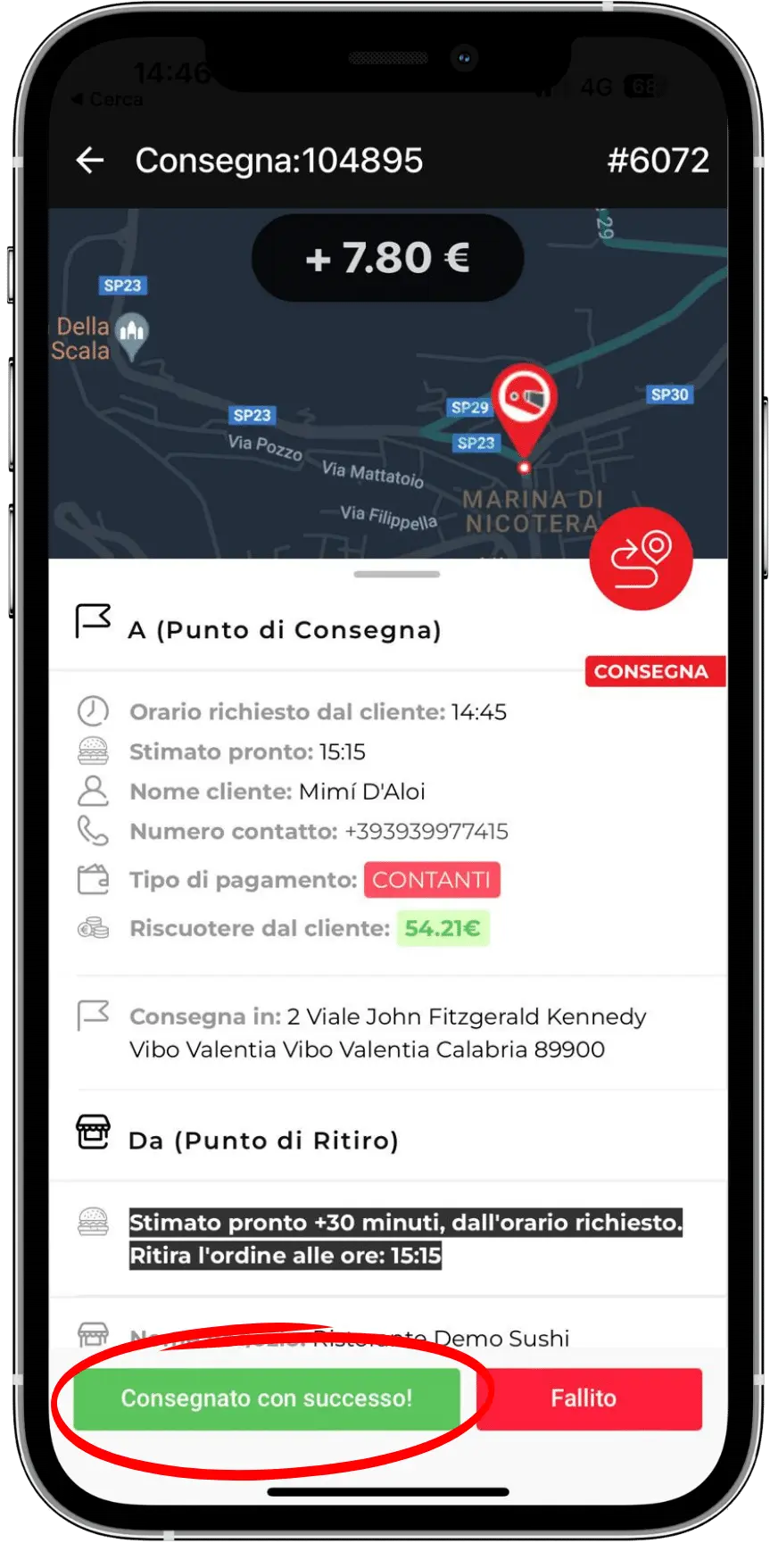 Vedrai tutti i dettagli e le informazioni sulla consegna, raggiungi il cliente e concludi cliccando sul pulsante. Ora attendi il prossimo ordine!